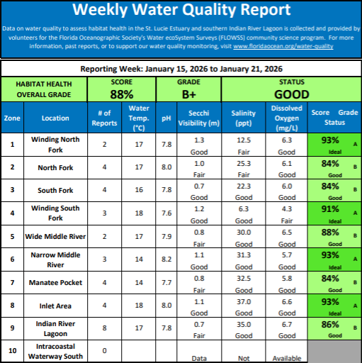 The chart below is published every week by the Florida Oceanographic Society https://www.floridaocean.org/ and shows the quality of our surrounding waters. You will find below the water quality chart for the week ending 1-21-26 . To access all reports use the following link: https://www.floridaocean.org/water-quality?eType=EmailBlastContent&eId=52ff9875-aec1-4e04-b228-842339907f64